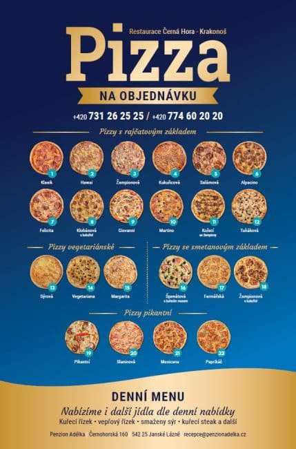 Pokud se rozhodnete strávit den v okolí Černé Hory, máte možnost využít restauraci v obědovém čase. Vybírat můžete z denního menu nebo naší stálé nabídky, ve které naleznete i různé pizzy. Naši kuchaři rádi uvaří také pro celiaky a diabetiky.